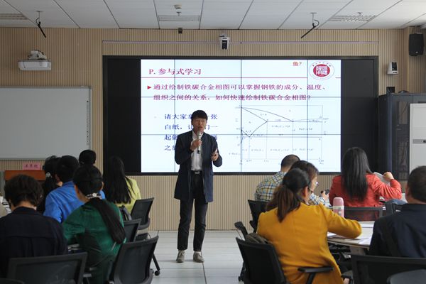 第二天,每位教师自选1个知识点,根据BOPPPS模组进行教学设计,并分组操练,通过演练、同侪互评、王教授点评、完善教学设计等环节进行内化吸收。分组演练结束后,王教授再集中所有参训者进行反馈总结,帮助指导提高。工学院徐云杰老师、社发学院王峰老师根据BOPPPS模组设计的课堂教学,获得了王教授及参训老师的一致好评。