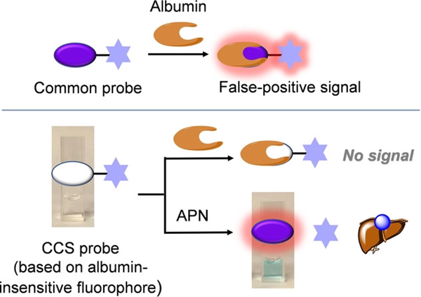 蛋白酶与许多疾病密切相关,利用光学探针对其高灵敏度、高选择性荧光成像与检测在人类健康研究中具有重要意义。然而,许多荧光探针或荧光团可与生物系统中普遍存在的白蛋白发生非特异性的相互作用,并导致显著的荧光信号增强现象,从而对蛋白酶的准确检测造成严重的假阳性干扰。这已成为一个棘手和难以解决的问题。