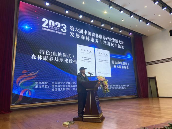 我校经济管理学院张建国教授是《特色(血糖调适)森林康养基地建设指南》的执笔人和《特色(血糖调适)森林康养规范》的主要参与人。该标准的发布将进一步规范森林康养基地建设,为我国森林康养产业的特色化、主题化发展提供强有力的技术支撑。浙江省林业产业联合会副会长、浙江省林业局原二级巡视员吴晓平代表编制工作团队,在会上介绍了两项标准的编制工作过程、成果的主要特色,并提出了成果应用的若干设想。