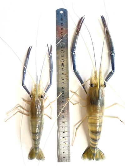 ▲罗氏沼虾“数丰1号”(左雌右雄)