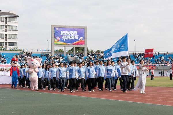 伴随着雄壮的《运动员进行曲》,国旗护卫队、校运动会会徽队以及全体裁判员、运动员迈着整齐的步伐,精神饱满地步入运动场。各代表队的方阵依次走过主席台前,向师生们展现着青春风采。